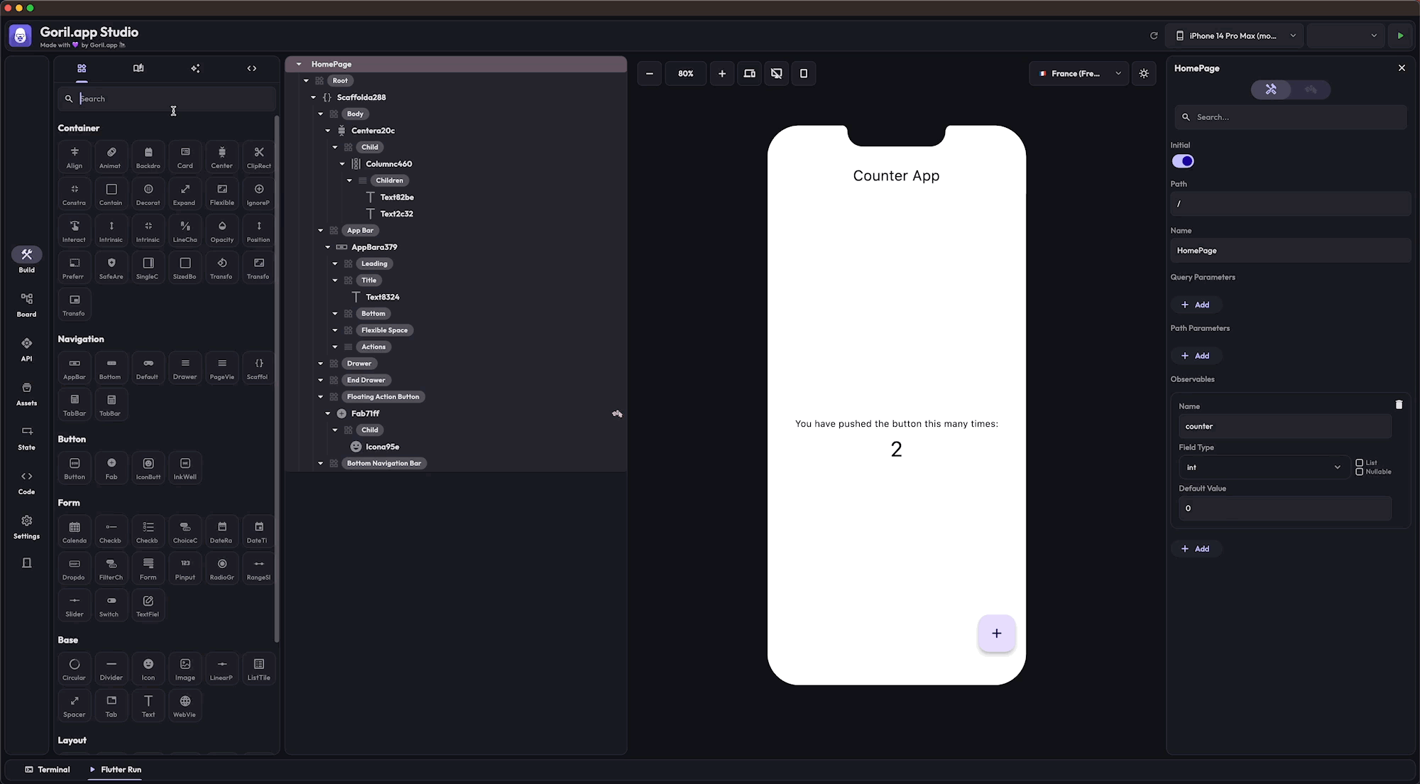 Goril.app Studio is a powerful visual interface that empowers developers to rapidly build user interfaces for Flutter applications using a drag-and-drop approach.