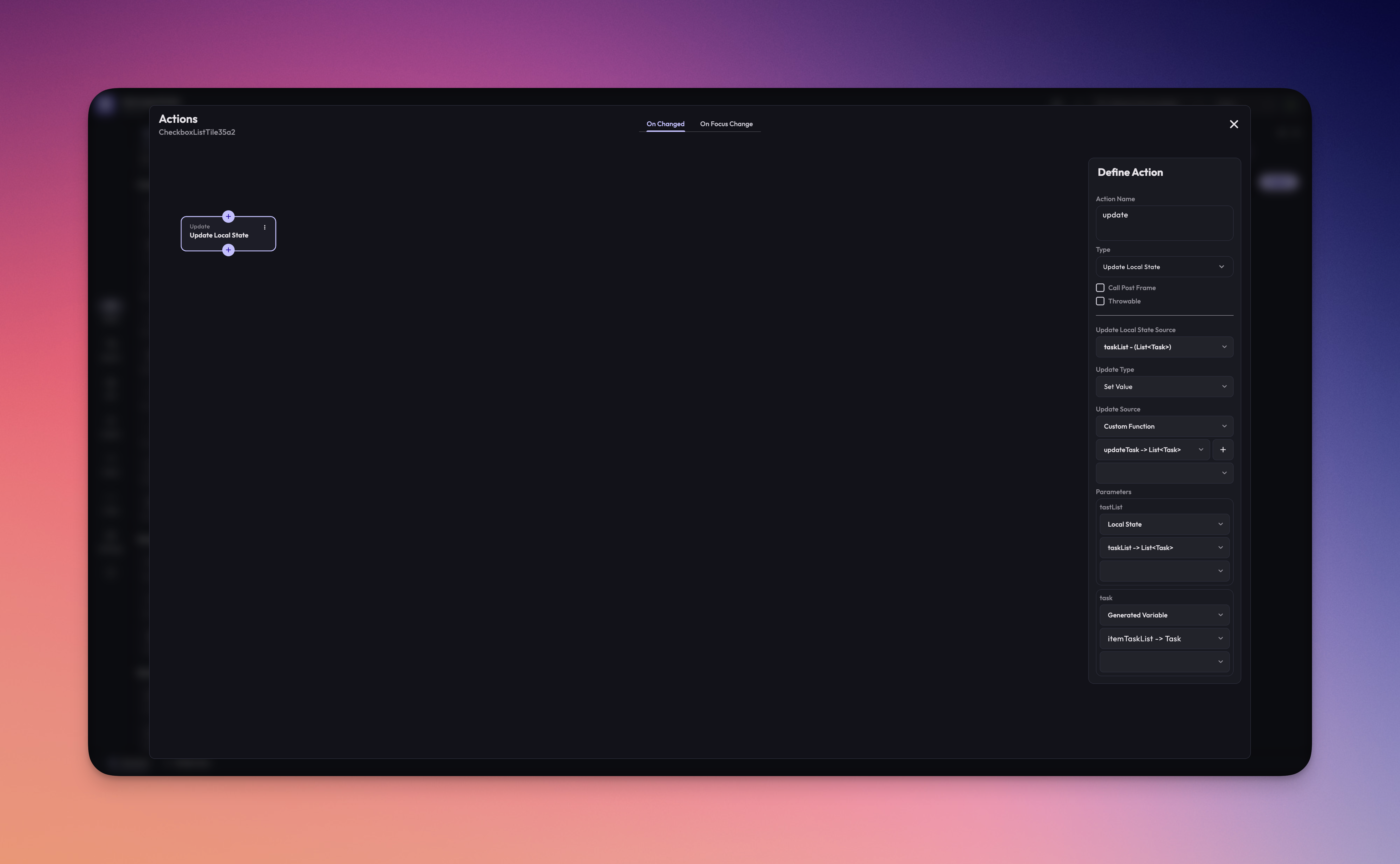 The Update Source is which data (i.e a list of task in this example) are we using to Set the Value in the local state. Select Custom Function and choose updateTask -> List<Task>.