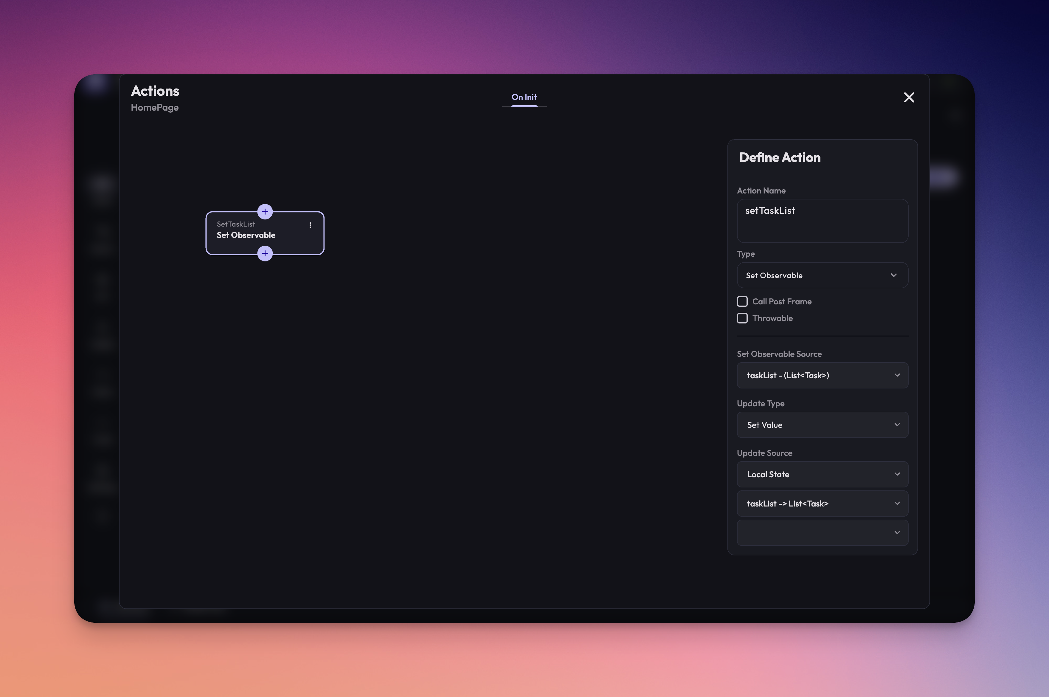 6. In **Set Observable Source** select the observable we have created on the HomePage **taskList - (List\<Task>).**
