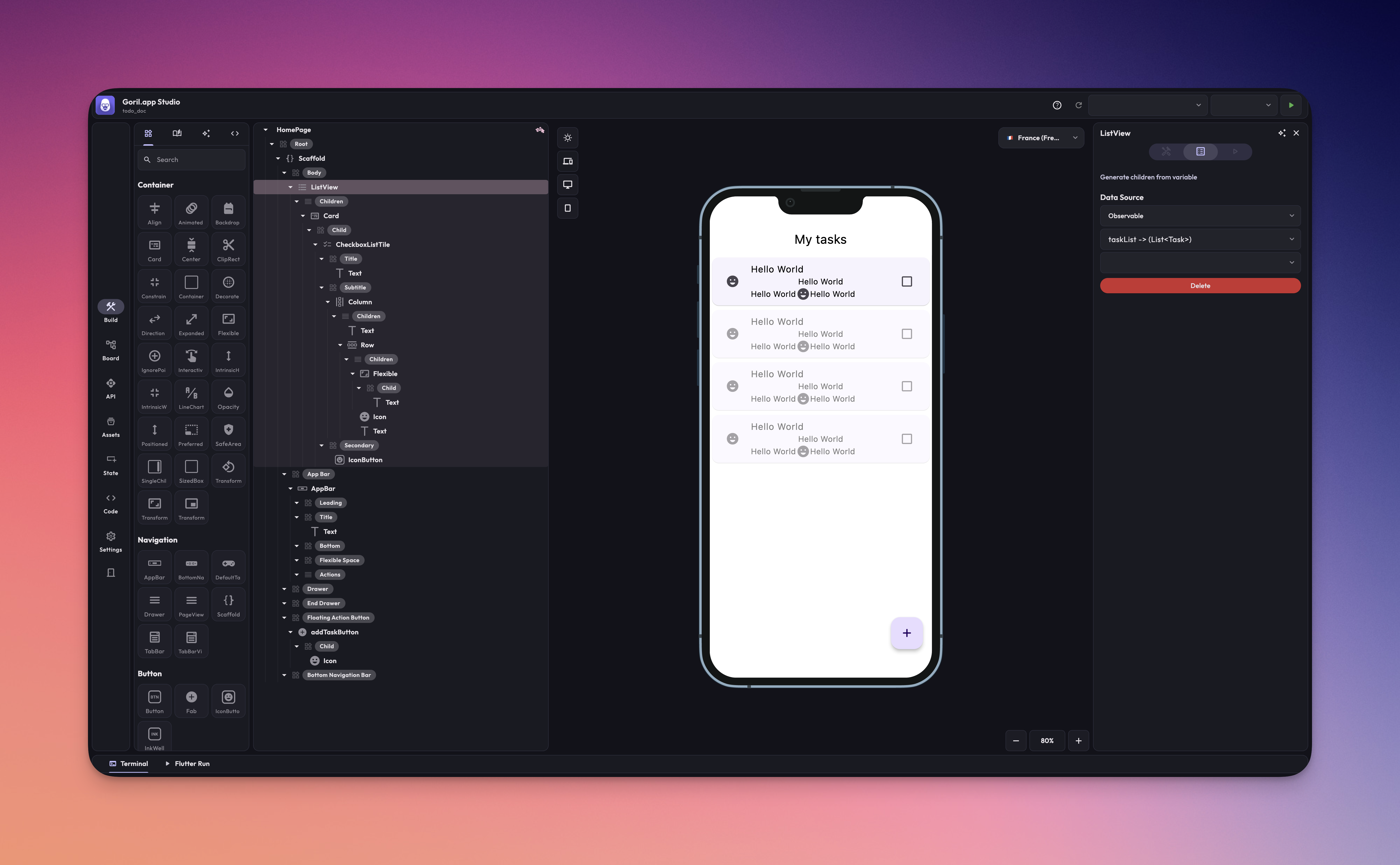 1. In the [toolbox](https://docs.goril.app/main-pages/architect/toolbox "mention") section, search and drag and drop a **ListView** in the Body of the Scaffold.